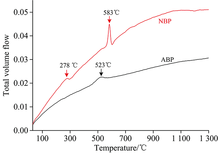CO2大量释放引起的, 而APB在523 ℃的峰值主要是H2O的大量释放所致。 NPB释放气体总流量明显高于APB, 且在陶瓷板烧成成熟的高温阶段, 仍然持续释放大量气体, 这正是产生气泡并最终导致陶瓷板表面凹坑状缺陷的根源。