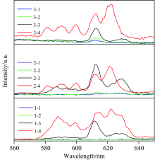 除了C2格位外, 立方结构中的Eu3+还可以占据具有中心反演对称性的C3i(S6)格位, 此时, 晶场引起Stark劈裂产生的三个5D0→ 7F1弱发光峰分别位于588, 594和600 nm处[3, 4, 5]。 而在单斜晶格中, Eu3+可以占据三个7配位的非中心对称格位[10, 17], 导致585~602 nm范围的5D0→ 7F1发射带出现多峰的特点, 从1-4#, 2-4#和3-4#样品的谱图上都可以观察到这样的光谱特征, 而且该发光带与单斜相的623 nm特征发光峰具有强度正相关关系, 随着623 nm峰的升高而增强, 这意味着薄膜中单斜相是这个带的主要贡献者。 对比900和1 100 ℃这两个发射谱还可以发现, 当Eu3+主要存在于立方晶格中时, 5D0→ 7F1与5D0→ 7F2发光积分强度(面积)的相对比例较小, 而当大多数Eu3+进入单斜晶格时, 不仅使上述比例增大, 而且导致5D0→ 7F1和5D0→ 7F2两个发光带都得以增强。 然而, EDS结果提示1 100 ℃退火后薄膜中Eu3+含量是明显减小的, 这表明单斜晶格中Eu3+的磁偶极发光效率比立方晶格中的要大。 由于两种结构的5D0→ 7F1发射峰的峰位相差不大, 二者贡献的叠加就形成了图3所示的中心位于590和600 nm的两个宽峰。 至于图3中的581 nm发光峰, 则对应于5D0→ 7F0电偶极跃迁, 当薄膜中立方相为主时, 该峰不明显, 而当单斜相特征出现时却明显增强, 意味着Eu3+所在的单斜格位应该具有更低的对称性, 可以作为Eu3+进入Y2O3单斜结构的一个特征信号。