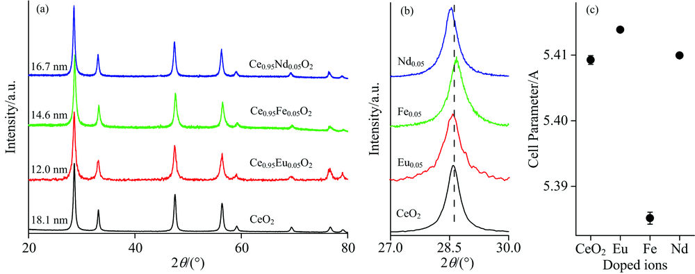 图1(a)为Ce0.95M0.05O2(M=Fe, Nd, Eu)的XRD图谱。 由图可知, 掺杂样品与纯CeO2的衍射峰一致, 均为纯相萤石立方结构(PDF#34-0394), 说明三种离子均成功掺入CeO2晶格中。 样品的晶粒尺寸如图中所标注。 三种掺杂样品的晶粒尺寸均比纯CeO2的粒度小, 表明掺杂离子会阻碍晶粒变大。 掺杂离子会引起固溶体晶格畸变而导致衍射峰位移动, 如图1(b)所示。 不同掺杂离子引起峰位移动方向不同, 其中Nd3+及Eu3+半径(