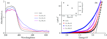 对样品的紫外吸收光谱进行直接跃迁模式拟合, 结果如图2(b)所示。 掺杂离子引起固溶体能隙发生红移, 具体变化为CeO2 (3.13 eV)> Ce0.95Eu0.05O2(3.04 eV)> Ce0.95Nd0.05O2 (2.94 eV)> Ce0.95Fe0.05O2 (2.75 eV)。 Ce0.95Fe0.05O2能隙降低最为显著, 其原因可能是由于Fe3+的3d轨道所形成的杂质能级更低, 而稀土离子Nd3+和Eu3+与Ce4+性质相似, 故能隙降低并不明显。 通过对比掺杂Nd3+和Eu3+样品可知, 含Eu3+样品能隙降低程度较小, 这可能是由于掺杂Eu3+固溶体晶粒尺寸最小, 存在量子尺寸效应而导致能隙增大。