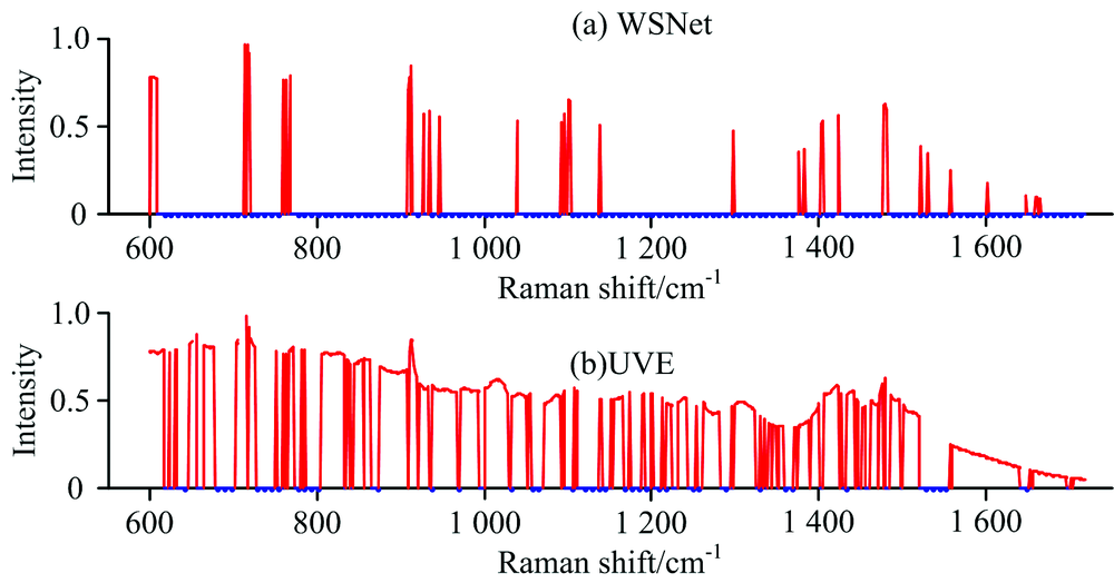 拉曼光谱的各个波长点之间存在严重的多重共线性, 采用全拉曼光谱数据用于NN和PLS-DA模型的构建, 得到的校正模型性能不够好。 利用WSNet对拉曼光谱进行处理, 去除了光谱中对建模有影响和无贡献的波长点, 对于校正模型的性能有显著的提升。 WSNet与经典的波长选择算法UVE相比也具有明显的优势, UVE算法的核心思想是在原光谱中引入人工随机变量, 将随机变量和光谱一起进行建模, 将原光谱中各个波长点的回归系数与随机变量回归系数的平均值进行比较, 如果原光谱波长点的回归系数低于人工随机变量回归系数的平均值, 就认为该变量是噪声变量, 应该被剔除。 由于UVE算法引入随机变量, 导致该算法存在一些随机因素, 使得每次筛选的结果都不相同, 但都表现出很强的一致性。 UVE在剔除波长点的过程中参考的是人工随机变量, 即随机噪声, 所以剔除的仅仅是影响建模的噪声波长点, 对建模既没有贡献也没有影响的波长点并不会剔除。 WSNet相比于UVE就要“ 激进” 许多。 WSNet由于是通过神经网络进行波长选择的, 同样也存在一些随机因素, WSNet是通过神经网络自学习能力自适应得到每个波长点的权重, 从而利用学得的权重对波长点进行筛选。 同时在权重学习的过程中加入了稀疏约束, 所以学得权重非常稀疏, 利用稀疏的权重对波长点进行筛选会变得更加容易。 通过上面的实验可以看出, UVE所选择的波长点比较多, 它并没有筛选掉太多的波长点, 是一种比较“ 保守” 的波长选择算法。 相比之下, WSNet所选择的波长点较少, 而且建立的校正模型性能更好, 证明了WSNet是有效的。