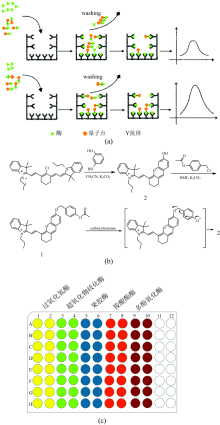 本研究基于荧光光谱阵列分析法的检测原理, 针对番茄中特征劣变蛋白酶的特性, 合成了具有定向特异性的荧光探针, 结合荧光免疫法和荧光探针法, 开发了多酶同时检测的荧光传感器阵列, 利用荧光酶标仪可针对不通荧光物质设置相应的激发波长和发射波长特点, 以及可以同时独立的检测多个样品的特性, 可实现多个样品中多种酶活性的同时快速可视化检测[图1(c)]。