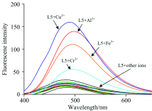 在探针L5有机溶剂溶液中, 探针L5的荧光强度按Cr3+, Fe3+, Al3+, Cu2+的顺序逐渐增强, 加入其他金属离子, 探针L5的荧光强度基本没有变化(图4)。