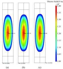 | 图2 石英管内XZ平面上电场分布图 (a): 80 mm; (b): 83 mm; (c): 86 mm; (d): 89 mmFig.2 Electric field distribution on the XZ plane in a quartz tube (a): 80 mm; (b): 83 mm; (c): 86 mm; (d): 89 mm |
