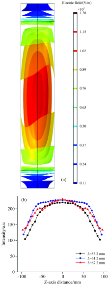 从图3中可以看出, YZ平面上的电场分布具有轴对称性, 强电场区域出现在石英管的中间段, 中心处(Z=0 mm)的电场强度最大, 增加反应腔长度和两路矩形波导的距离, 可以使Z轴上强电场区域的长度略微增加, 但中心位置的电场强度变化并不明显。
