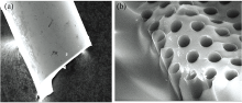利用扫描电镜和拉曼光谱仪对石墨烯光纤进行表征。 如图3(a)石墨烯光纤电镜图所示, 可以看到生长后的石墨烯在光纤表面也会出现, 在图3(b)中可以清楚看到甲烷分解后形成的石墨烯薄膜正在紧密的贴在光子晶体光纤空气孔中。