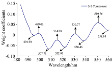 将经过SG平滑处理后的483.11~559.98 nm波段光谱信息经PCA处理, 得到各个主成分数据后, 运用式(3)计算各主成分变量下的Wilks Λ 统计量值, 选出Wilks Λ 值最小的主成分变量为第3主成分(the 3rd PC), 并绘出主成分3的权重系数图, 如图3所示。