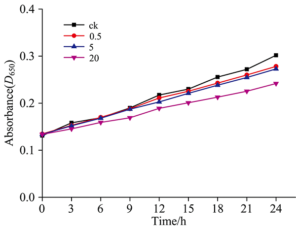 取处于生长稳定期的斜生栅藻, 使用血球计数板(北京索莱宝科技有限公司)获取微藻生长稳定期的生长状态, 初始藻密度为3.6× 106个· mL-1。 实验使用8个洗净且经压力蒸汽灭菌器(XFS-280MB)高温高压灭菌的2 000 mL的三角锥形瓶, 设置三个实验组A, B和C, 一个对照组CK, 另外每组设置两个平行组, 向实验组和对照组中加入相同密度的斜生栅藻以及相同的标准BG11培养基。 其中实验组A, B和C中分别加入0.5, 5和20 mg· L-1的Pb(NO3)2溶液, 对照组CK不做处理, 将实验组和对照组置于光照培养箱中, 培养箱中光照强度在4 000 Lux, 光周期为12L:12D。 每日固定时间点摇匀锥形瓶4次, 通气培养, CO2浓度为2%, 培养温度为(25± 1) ℃, pH值为7.0。