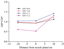 图4为不同位置处OH* /CH* 强度比值, 不同平面处OH* /CH* 强度比值随O/C的变化不同。 O/C< 1.2时, 不同位置处OH* /CH* 随着O/C增加逐渐增加, 而当O/C=1.2时, 氧气气速将达到150m· s-1, 此时流场相比之前发生变化, 在喷嘴平面以下位置, OH* /CH* 强度较小, 而在喷嘴平面以上位置逐渐增大。 通过对比不同O/C, 喷嘴平面处, OH* /CH* 强度最小, 此处化学激发占主导。 由图3可知, 化学激发主要发生区域在-10 cm≤ L≤ 10 cm范围内。OH* /CH* 变化可以反映激发路径的变化。