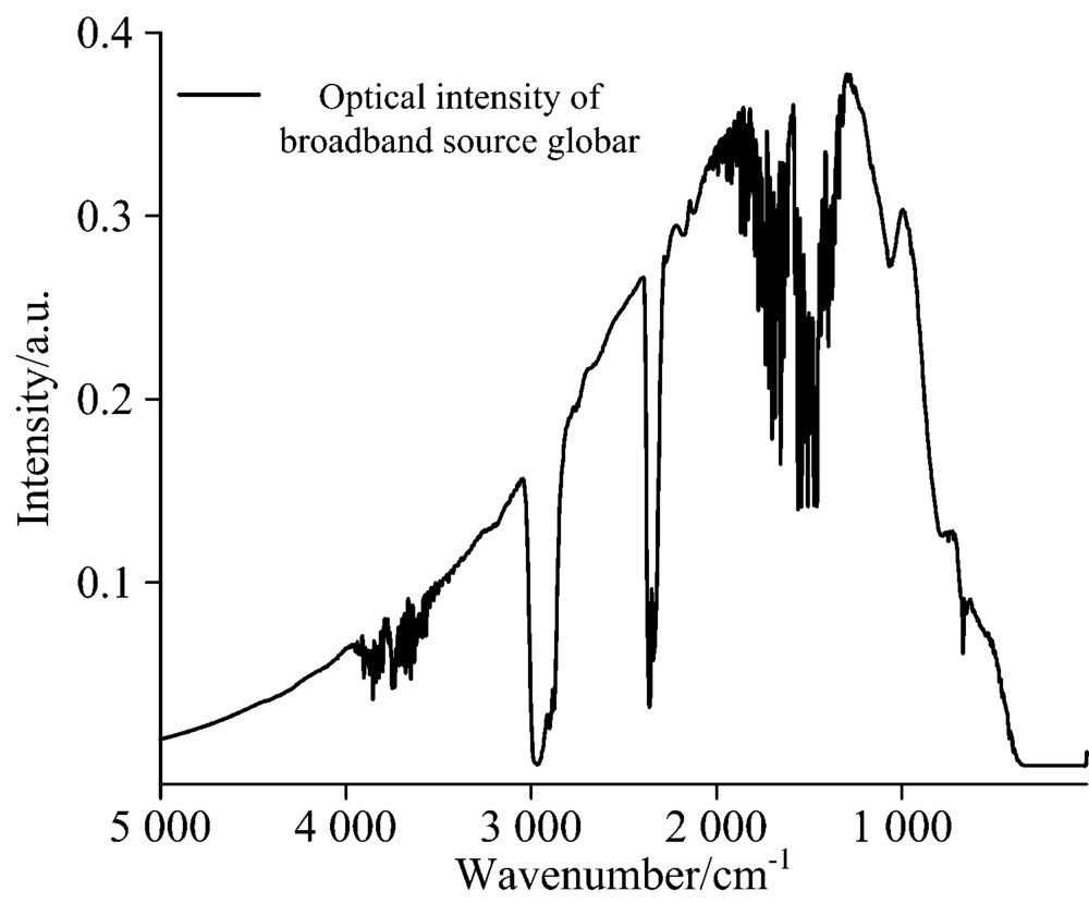 FTIR光谱仪基于对Michelson干涉后的红外光进行傅里叶变换, 可克服色散型光谱仪分辨能力低、 光能量输出小、 光谱范围窄、 测量时间长等缺点。 光谱B(σ )与入射光I(δ )满足如式(1)所示的傅里叶余弦变换关系。 σ 和δ 分别为光谱波数和两臂之间的光程差。