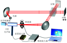 所设计的T型光声池主要包含吸收腔和共振腔两个部分, 入射光贯穿照射吸收腔, 其截面尺寸可根据入射光光斑等特性改变; 共振频率主要由共振腔决定, 产生的声波在共振腔的开端被反射而形成声驻波。 共振腔与入射光路垂直, 其长度不受水平面狭窄空间的影响, 故可在有限的空间中实现低频率共振, 满足机械调制的需求。 微音器位于共振腔顶端远离入射光路, 避免了由杂散光引起的系统噪声。 经验证T型光声池的共振频率为342 Hz, 光声池常数为2 063 Pa· cm· W-1 [14], 属于高品质光声池[15]。