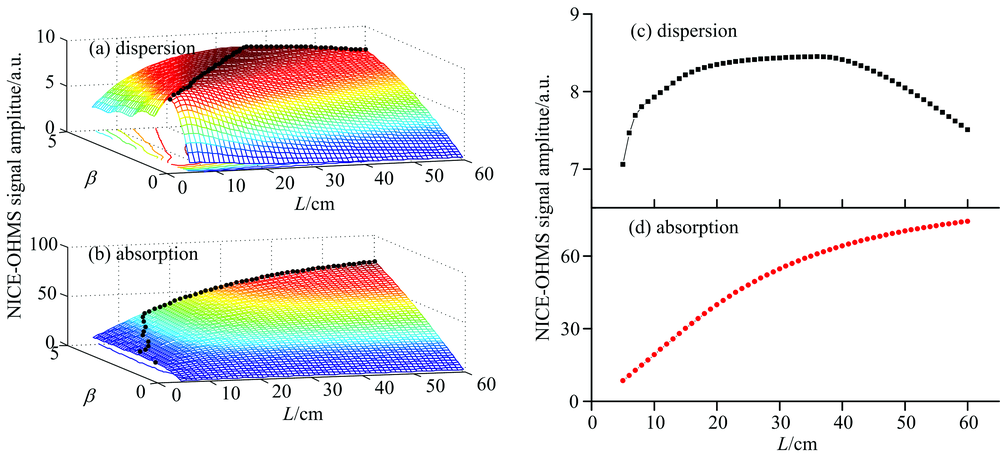 图3是模拟得到的FP腔长L以及调制系数β 对NICE-OHMS色散和吸收信号幅度的影响。 从图3(a)和(b)可见, 当采用一定的β 时, 不同L对应的信号幅度变化趋势与图2所描述的相似, 而NICE-OHMS信号幅度对β 的响应随着腔长而改变。 当L增大时, 信号幅度最大时对应的β 值也增大, 如图3(a)和(b)中的黑色点线所示。 图3(c)和(d)分别表示NICE-OHMS色散和吸收信号幅度最大值随腔长L的变化, 其与图2(b)的变化趋势相似, 即: 色散信号的最大幅度是先增加后减小, 吸收信号的最大幅度单调递增, 但增速逐渐变缓; 区别在于L变大时色散信号最大值变化趋势变缓, 在腔长为20~40 cm之间, 最大色散信号幅度几乎不变。 在图2(b)中, 腔长大于20 cm时, 吸收信号幅度达到饱和, 而图3(d)中, 腔长大于50 cm时, 吸收信号最大幅度才趋于饱和。 这是由于随着腔长的增加, 获得最大信号幅度的调制系数β 也增大, β 的增大将导致信号幅度的增加。 通过比较图3(c)和(d), 吸收信号的最大幅度大于色散信号, 并且吸收信号的最大幅度随腔长的变化率更大。