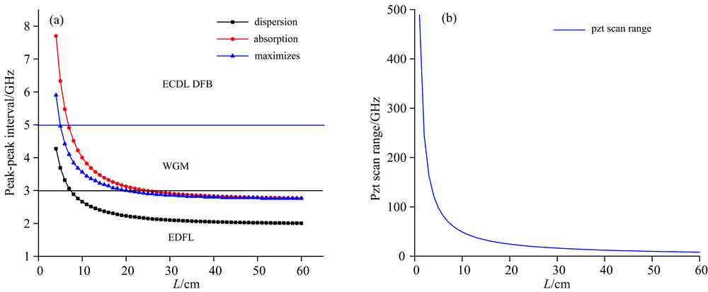 图4(a)数值模拟了腔长4~60 cm时NICE-OHMS信号的峰峰频率间隔, 其中红色、 黑色和蓝色点线分别对应吸收、 色散和幅度最大解调相位时的信号, 黑色和蓝色实线分别对应了3和5 GHz的频率间隔。 这两个特征频率间隔对应EDFL和WGM分别能达到的最大调谐范围。 由图可知, 随着腔长的增加, 线型函数的峰峰频率间隔逐渐减小, 这是由于腔长越长, 调制频率ν m越小, 边带与载频的间距也越小。 色散信号的谱线宽度明显小于吸收信号, 是因为色散信号中线型函数的载频项与边带项相位相反, 使得色散信号的峰值向吸收线中心靠近。 幅度最大相位时的峰峰间距随着腔长的变化趋势与色散和吸收相位相同, 且逐渐靠近吸收相位。 我们以NICE-OHMS信号的峰峰间距作为测量的最小频率范围。 当腔长大于8 cm时, 色散信号的峰峰间距小于3 GHz, 光源可以采用EDFL; 吸收与最大信号相位时的峰峰间距小于5 GH{, 可以采用WGM激光源。 当腔长大于25 cm时, 色散、 吸收以及最大信号相位时的峰峰间距都会小于3 GHz, 可以使用EDFL。