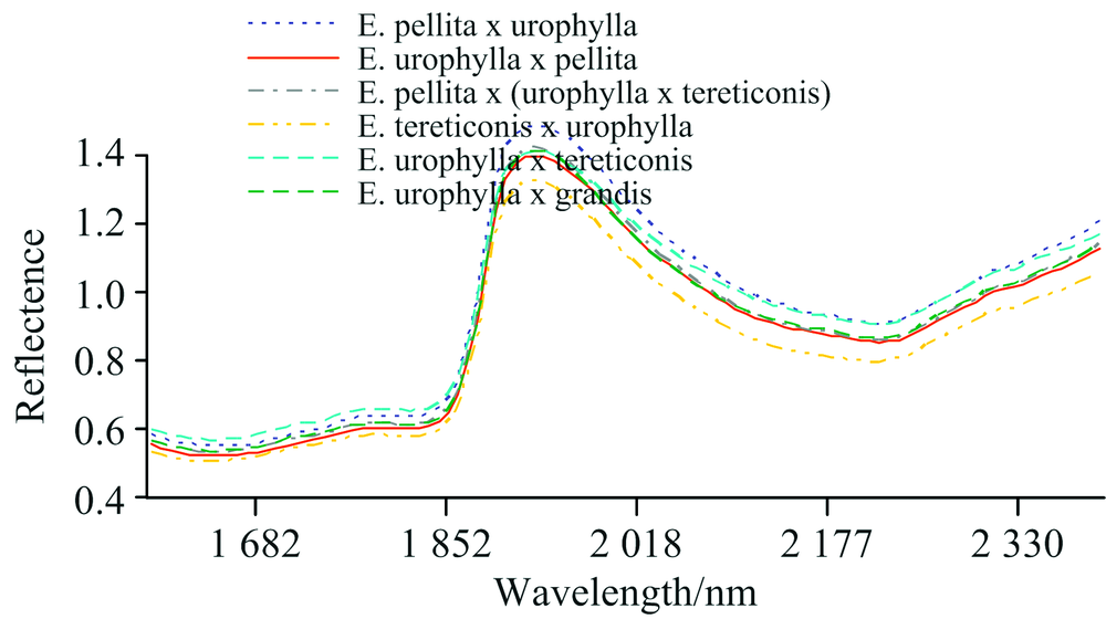 NIRs主要是物质有机分子的倍频与合频吸收光谱, 不仅能得到物质的分子结构、 组成和状态信息, 也能反映密度、 粒度、 高分子物的聚合度及纤维形态等物质的物理状态信息[10]。 图1是6个桉树杂交组合原始NIRs的平均值曲线, 通过NIRs原始光谱的直观变化很难发现其特征峰, 6种组合的NIRs信息在全波段变化趋势基本一致, 且存在明显的重叠。 在波长1 860 nm之前和波长1 940 nm之后, 6个杂交组合的NIRs反射率在一定程度上存在差异, 但不足以据此进行树种判别。