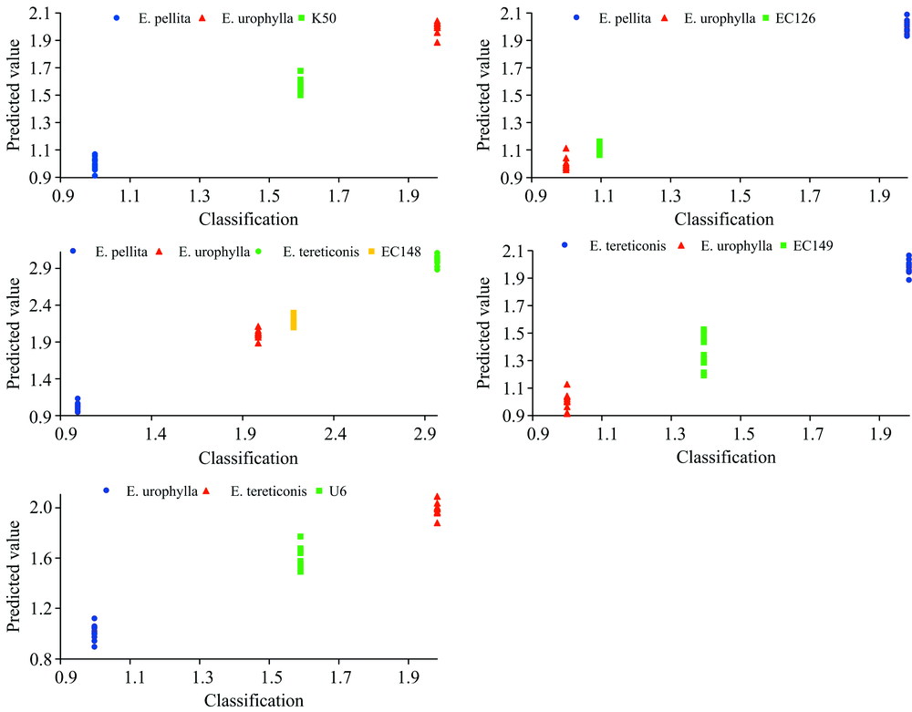 图5展示了5个组合的桉树杂交亲本PLS模型对亲本和杂交子代样本的预测结果。 结果显示, 每个亲本的预测值都集中在各自响应变量周围(1, 2和3), 且集中度很高。 杂交种K50的预测值为1.5~1.7, EC126的预测值为1.1~1.2, EC148的预测值为2.1~2.3, EC149的预测值为1.2~1.5, U6的预测值为1.5~1.8。 预测值显示, EC126和EC148的预测值高度重叠, EC149预测值的变异幅度最大, K50和U6预测值的变幅居中。 PLS-DA判别可以清晰地将不同基因型区分开来, 不过, 任何判别方法都需要专业知识来配合解读分析结果。