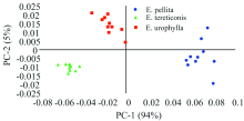 将6个杂交种同时进行PCA分析时, 各杂交种存在一定程度的重叠(未展示), 这主要与其亲本的遗传亲缘关系有很大的关系。 另外, 因子得分的聚集度也反映了杂交种遗传变异的大小, 聚集度高的变异小, 反之亦然, 如图2中EC126, K50和EC149的变异可能较大, EC148和U6的变异则相对较小。