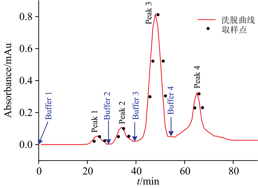 图4中藻蓝蛋白的相对含量先上升后下降, 最高达到95.2%, 且相对集中分布于前半段, 这表明藻蓝蛋白与别藻蓝蛋白未能完全分离, 从而制约了藻蓝蛋白纯度的进一步提高。 由于Buffer 3的离子强度进一步提升, 非吸附作用特别强的组分均会被洗脱下来, 故藻蓝蛋白与别藻蓝蛋白应带有较多负电荷, 且数量接近。 由于藻蓝蛋白与别藻蓝蛋白的浓度比约为2∶ 1, 故藻蓝蛋白会相对集中的被分离出, 但不能完全排除别藻蓝蛋白的干扰。