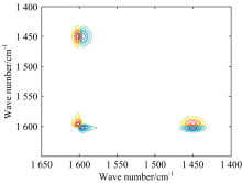 基于以上结论, ASAP-2T2D-异步相关光谱进一步应用于实际体系中分子间相互作用的表征。 在前期工作中, 配置了四个溶液, 利用ASAP-异步相关光谱对苯并-15-冠醚-5(BC)与Li+之间的相互作用进行了研究[14]。 从四个溶液中选取前两个进行ASAP-2T2D-异步相关光谱分析。 根据式(10), S的浓度分别设置为0.41和0.30 mol· L-1; S的峰位、 半高半宽和摩尔吸光系数分别设置为1450, 10和1。 如图3所示, BC/Li+/CH3OH体系对应的ASAP-2T2D-异步相关光谱的交叉峰峰型与ASAP-异步相关光谱的交叉峰峰型完全相同[14], 即一区中的交叉峰峰型表明Li+与BC之间的相互作用使BC特征峰的峰位发生了变化, 而二区和三区中的交叉峰左右两部分强度的绝对值不同(左右两部分强度的绝对值大小表现为等高线的圈数, 圈数越多, 绝对值越大), 表明Li+与BC之间的相互作用使BC特征峰的峰强也发生了变化。 以上结果进一步证实了ASAP-2T2D-异步相关光谱可正确表征分子间相互作用。