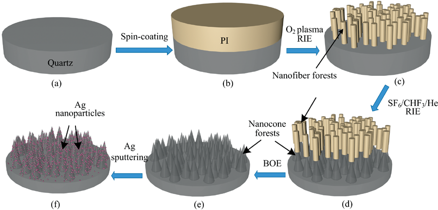 本文所涉及的这种新型纳米结构制备技术由常规干法去胶工艺发展而来。 根据我们前期的研究工作, 利用等离子体轰击光刻胶, 能够形成大面积的纳米纤维森林结构[6, 7, 13, 14]。 基于这种现象, 图1给出了石英纳米锥森林结构和SERS透明器件的制备工艺流程。 首先, 在石英衬底[图1(a)]上旋涂约为7 μ m厚的PI层[如图1(b)所示]。 之后, 采用氧等离子体对PI层进行轰击, 轰击过程中氧气流量为50 sccm, 腔体压强为5 Pa, 腔体功率为200 W, 时间持续40 min。 这一步骤之后在石英衬底上得到了分布密集的纳米纤维森林结构[如图1(c)所示], 该森林结构由大量直立于衬底上的纳米纤维构成。 可作为干法刻蚀的纳米掩模。 采用反应离子刻蚀(RIE)的方法对石英衬底进行各向异性刻蚀, 形成纳米纤维-石英纳米锥双层森林结构[如图1(d)所示]。 RIE工艺过程中混合气体及其流量为SF6/CHF3/He: 5/32/150 sccm, 射频功率为200 W, 腔体压力为1 850 mTorr, 刻蚀时间6 min。 随后, 在室温下利用NH4F∶ HF为7∶ 1的氧化腐蚀缓冲剂(BOE), 对纳米纤维森林结构漂洗5 s, 使之完全去除, 即可得到石英纳米锥森林结构[如图1(e)]。 最后, 通过磁控溅射工艺, 在石英纳米锥森林结构上制备约5 nm厚的银纳米颗粒层, 进而得到基于石英纳米锥森林结构的SERS透明器件[如图1(f)]。 溅射过程中, 保持功率为50 W, 腔体真空度稳定在6× 10-4 Pa。