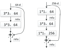 ResNet50应用到残差结构, 残差结构其首段和末端的1× 1卷积用来减少和恢复维度, 这两种结构的时间复杂度相似, 但是其结构数量增加, 网络深度增加, 同时解决了退化问题, 性能不断提升。 如图4和图5所示。