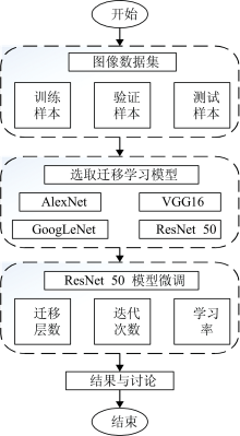 设计四组实验, 通过验证集准确度、 测试集准确度以及运行时间三个条件来选定分类模型, 并集中探讨了模型的迁移层数、 迭代次数、 学习率以及Mini Batch Size对评价指标的影响。