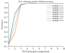 使用不同的数据分析方法建模时, 都需要进行调参。 采用PLSDR和Softmax进行分类时, 可以设定主成分数ncomp=[1∶ 60]以及正则项参数λ (lambda)=[1e-1, 1e-2, …, 1e-8]进行网格调参。 图4和图5是分别使用标准化和ZCA白化预处理后的调参结果。 从图4可以看出经过标准化预处理后PLSDR算法降低到40个主成分, 识别结果趋于稳定(96.54%± 0.05%), 当主成分数大于40时, 正则项参数的影响弱化。 ZCA白化预处理后的调参结果与标准化类似, 但是可以降低到4个主成分来表示。 正则项参数是用来防止模型过拟合的, 但是这个参数不是非常敏感。 如果设置太大, 会出现欠拟合现象。 由于降低到一定主成分数之后, 正则项参数的影响效果不是很明显, 本实验统一设置λ 为1e-6。