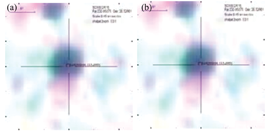 (1)由星系并合过程引发的外流所致。 我们推测这种可能是比较大的, 文献[12]在超亮近红外星系星表中, 记载着该目标经历着并合活动; 图5显示了SDSS和2MASS的测光图像, 从光学图像(a)和近红外图像(b)差异上, 可以推测可能存在两个叠加的源, 而光学图像的右边可能存在一个不太明显的轮廓。 这也可以解释前文光学光谱的类型和近红外光谱的类型不一致的原因。