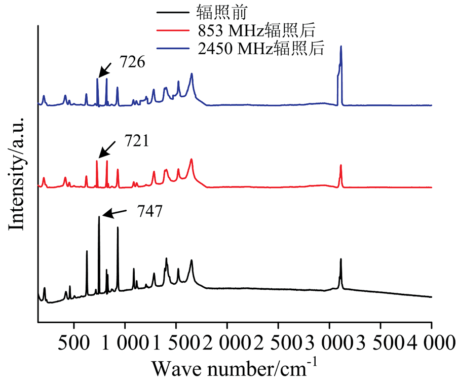 The vibration peaks of sulfur-containing bonds of benzothiophene and 3-thiophenecarboxylic acid are red-shifted by microwave action. The vibrational peaks of carbon-sulfur bond in 3-thiophenecarboxylic acid and benzothiophene are red-shifted 26, 20 cm-1 by 853 MHz and 21, 26 cm-1 by 2 150 MHz respectively. The movement of the Raman spectral vibration peaks indicate that the energy bands and structure have changed. In the thiophene model compounds, the sulfur-containing vibration peaks shift toward the long wavelength direction. It indicates that the wave number is reduced, the energy of the photons lower, the band gap is smaller and the groups are more unstable. Therefore, the energy of microwave changes the microscopic environmental structure of the model compounds molecules. As a result, the lattice vibration frequency of the model compound and the relative motion of the atom increases, and the vibration recovery force and the molecular stability decreases.