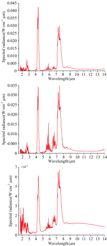乙酸乙酯火焰光谱辐射主要来自于分子辐射, 2.5 μ m为H2O的特征峰, 2.7 μ m为CO2和H2O的特征峰, 4.3 μ m为CO2的特征峰, 5.5~7 μ m波段为H2O分子特征峰波段, 5~14 μ m有一定的热辐射, 中心波长在9 μ m, 由维恩定理可得温度为321 K, 可认为是加热的铁盆发出的热辐射。