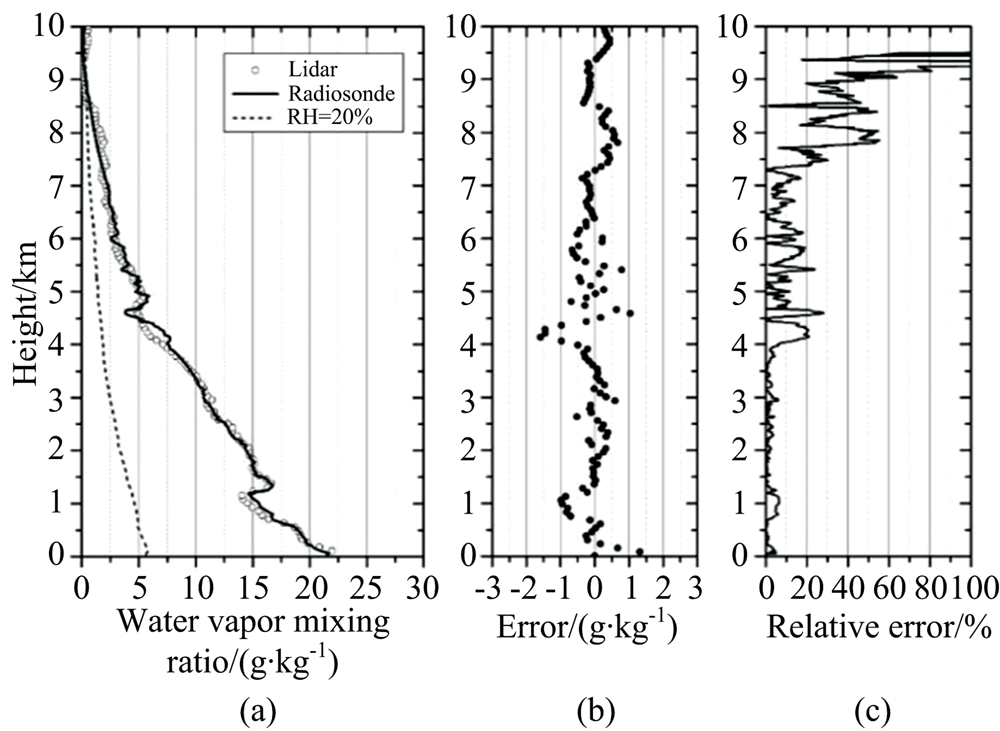 图4为2014年7月28日激光雷达和无线电探空仪探测的水汽混合比, 本次观测地点位于中国科学院合肥物质研究院大气光学中心, 观测时间为19:30— 20:00, 在观测地同时释放探空气球进行对比验证。 图4(a)显示了无云条件下, 10 km以内的激光雷达和无线电探空仪探测的水汽混合比。 图4(b)和(c)分别为激光雷达探测的水汽与无线电探空仪探测的水汽之间的误差和相对误差。 由观测结果可知, 4 km以内的相对误差不超过5%, 7.5 km以内的相对误差不超过20%。 同时由于几何因子的影响, 400 m以内的误差较大。