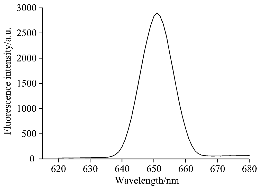 图1和图2是微波合成的CdTe纳米材料的TEM图谱和荧光光谱图。 从图中可以看出, 微波辐射法合成的CdTe纳米材料大小粒径比较均匀, 粒径约为4.5 nm, 参照Demas[15]的方法来测试该量子点的量子产率达52.341%。 该CdTe纳米材料的最大发射波长为650 nm, 半峰宽为45 nm。