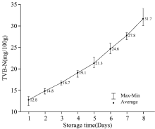 国家标准(GB/T 5009.44— 2003)规定对肉质TVB-N含量的检测采用半微量定氮法, 据此方法测定结果如图3所示。 从图中可看出, TVB-N含量总体上随着时间推移而不断增加, 从第5日起TVB-N含量加速增加。 该结果表明, TVB-N含量是肉品腐败程度的反映, 存放第5日后, 肉品表面的微生物污染逐步向深层蔓延, 蛋白质分解加剧, 导致肉品理化性质改变。