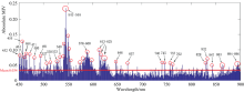 由图7可见, MIV数值较大的波段集中分布在7个波峰附近。 在VIS波段(450~780 nm), 第一个波峰出现在471 nm, 即以波长471 nm为中心, 左右两侧20 nm内有452, 455, 461, 480和491 nm特征波长, 这些波长为肉品中高铁肌红蛋白的吸收峰区。 第二个波峰出现在544 nm, 即以波长544 nm为中心, 左右两侧各20 nm内有527, 530, 533, 540和541~555 nm特征波长, 这些波段为肉品中氧合肌红蛋白的吸收峰区。 第三和第四个波峰出现在588和613 nm, 这两个波峰两侧各有578~600和613~625 nm特征波段, 分别为高铁肌红蛋白和硫肌红蛋白的吸收区。 第五个波峰出现在740 nm, 以波长740 nm为中心, 左右20 nm内有745, 757和762 nm特征波长, 这些波长为肉品O— H键的第三倍频的吸收峰区[16]。 在NIR波段(780~950 nm), 第六个波峰出现在832 nm, 以832 nm为中心波长, 左右20 nm内有828和847nm特征波长, 这三处特征波长为氨中N— H键第三倍频的吸收峰。 最后一个波峰出现在894 nm, 其两侧的特征波长863, 895和896 nm为肉品C— H键第三倍频吸收峰[17]。