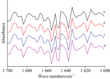 | 图6 血红蛋白酰胺I带二阶导数谱和去卷积谱 (a): 二阶导数谱; (b): 去卷积谱Fig.6 Secondary-derivative and deconvolution spectra of Amide Ⅰ bands of Hb (a): Secondary derivative; (b): Deconvolution |