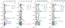 Fe在垂直方向上由浅到深呈先减小再增加的趋势, 在近地表及深部矿体范围明显富集, 在50, 250, 650和900 m等点处有明显正异常, 观察样品手标本发现样品中肉眼可见大量黄铁矿颗粒, 推测是黄铁矿导致Fe出现峰值。