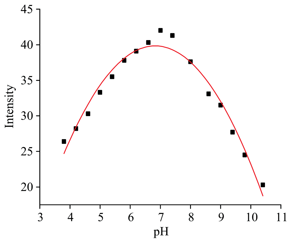调整光度计各项参数, 设置激发波长为320 nm, 分别对系列pH的LMG溶液和缓冲液进行荧光光谱检测, 得到数据并保存; 以pH值为x轴, 荧光峰峰值强度(intensity)为y轴, 制作荧光峰峰值强度随pH变化曲线。