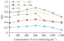 本研究显示, 嗜酸乳杆菌在含Zn培养液中的生长曲线呈倒U字型(图2), 在Zn浓度为600 ng· mL-1时到达顶点, 这一结果对在嗜酸乳杆菌培养液中添加微量元素以控制其生长速度具有参考价值。