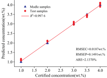 PLS算法的引入虽然在一定程度上提高了模型的精确度和稳定性, 但提高程度仍然不够, 因此引入了LSSVM算法来对定标模型进行校准。 校准结果如图7所示。 从图中可以看出, 定标曲线的R2有了明显的提高, 提高到了0.997 6, 拟合效果较好。 同时, RMSEC和RMSEP分别下降到了0.018 7 Wt%和0.149 1 Wt%, ARE下降到了2.137 0%。 相比于内定标法和PLS, LSSVM的RMSE和ASE均得到了很大程度的降低, 模型的稳定性和精确度都得到大幅度的提高, 基本消除了因基体效应和自吸收效应给实验结果带来的影响。 具体对比结果如表3所示。
