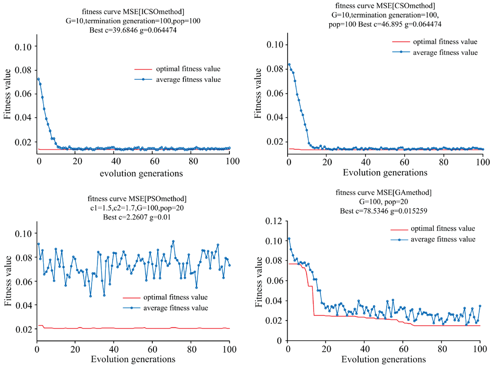 CSO, ICSO, PSO和GA四种优化方法的适应度曲线变化情况如图5所示。 CSO的最佳适应度值在第8代附近达到最小值, 其平均适应度曲线在12代左右以后保持最小值。 ICSO的最佳适应度曲线在第1代即收敛到最小值并且以后保持不变, 其平均适应度曲线12代左右后保持最小值, 并且ICSO最佳适应度与平均适应度曲线间的距离比CSO的更小, 说明ICSO适应度曲线的拟合度比CSO的更好, 并且ICSO的收敛速度也优于CSO。 PSO虽然最佳适应度一直保持稳定, 但平均适应度与最佳适应度之间的差值过大。 GA的最佳适应度值在67代以后才能达到稳定。 综合四幅图, ICSO在收敛速度和拟合效果上, 都是最优的。