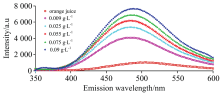 且橙汁溶液在发射波长460~560 nm有显著的荧光出现。 从相关文献[17]上看, 橙汁的激发波长位于470 nm时, 会有发射波长530 nm左右的荧光峰, 会对山梨酸钾的荧光光谱有一定的干扰, 所以准确检测山梨酸钾浓度是比较复杂的。