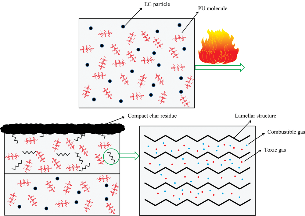 通过TG-FTIR, XPS以及SEM分析, 可以得出RPUF/EG复合材料阻燃机制。 如图8所示: RPUF/EG复合材料中膨胀石墨颗粒内部的硫酸、 硝酸等酸性物质燃烧过程中发生分解释放大量酸性气体, 这些酸性气体一方面促进硬质聚氨酯泡沫硬段的降解, 使得其第一阶段降解产物释放量明显增加, 同时使得膨胀石墨颗粒发生膨胀, 形成“ 蠕虫状” 结构。 同时, 膨胀石墨可以促进硬质聚氨酯泡沫中C和N等元素以芳香环或芳杂环形式形成致密炭层, 这些致密炭层与“ 蠕虫状” 结构一起覆盖在燃烧区域表面, 有效抑制燃烧区域物质以及能量的输运, 从而达到阻燃目的。 此外, 膨胀石墨形成的“ 蠕虫状” 结构中的封闭空间作为“ 微反应器” 有利于聚氨酯分子链软段降解产物(CO等)之间的相互反应, 使得其滞留在凝聚相成炭, 有效降低聚氨酯分子降解后期的有毒烟气生成, 提高RPUF/EG复合材料火灾安全性。