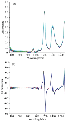 原始光谱数据中除了包含有用的化学信息之外, 还包含大量的无关信息。 因此, 在建立模型之前需要进行光谱预处理。 图2(a)显示了不同动力粘度值润滑油的可见-近红外吸收光谱, 可以看出在近红外部分, 光谱曲线基线偏移严重, 所以我们采用Savitzky-Golay卷积平滑进行数据预处理, 平滑窗口大小为5, 并对其进行一阶求导。 图2(b)为吸光度光谱的一阶导数光谱, 从中可以看出一阶求导可以有效地消除基线漂移和背景噪声。 由于样本采集量较多, 因此在采集过程中很容易出现界外样本, 会对建模和预测结果产生很大的影响。 我们采用主成分分析(PCA)和马氏距离(MD)相结合的方法来识别浓度界外样本, 剔除了3个界外样本, 主成分分析法对数据作降维处理。