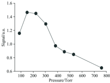 理论上, 压力增加, 分子碰撞效率增加, 光声信号随之增加。 但是在石英音叉光声光谱中, 石英音叉的品质因数随压力降低而增加, 因此石英音叉增强光声光谱中, 存在一个最佳的测量压力, 由此可以获得最大的石英音叉光声信号。 在相同浓度CO2样品条件下, 改变OB-QEPAS的测量压力。 实验测量中使用了浓度为1 000 μL·L-1 的CO2标准气体, 在每个压力下都对石英音叉的共振频率f0、 最佳调制振幅进行了测量, 然后把激光的调制频率和调制振幅都设在最佳值。 图7是在每个压力相对应的最佳振幅和频率下测量得到的结果, 可以看出在压力150 Torr处, 信号值最大。 在常压下, 从图6可以得出, 1 000 μL·L-1 CO2的在最佳振幅处的信号为0.65 mV。 压力为150 Torr时信号为1.46 mV, 比常压下提高2.24倍, 但是在低压下需要压力控制器、 泵等外围设备, 增加系统的复杂性、 成本和体积, 因此在常压下实验比较合适, 有助于实际应用和后期的集成工作。