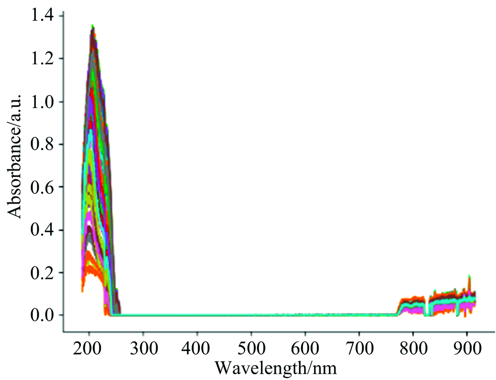 Water samples were obtained from potassium hydrogen phthalate standard samples of different concentrations prepared by the National Nonferrous Metals and Electron Materials Analysis and Testing Center. Some of the water samples were diluted with pure water. Finally, a total of 200 water samples were obtained, and the true COD values of the water samples ranged from 0~500 mg·L-1. The UV-visible absorption spectra collected from these samples are shown in Figure 2.