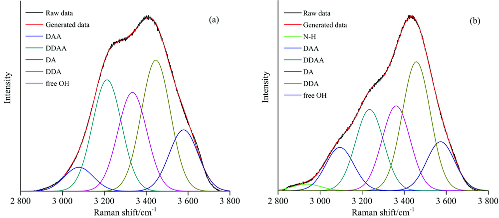 图4(a)和(b)分别为磁化2 h后质量分数为10%和20%的NH4Cl水溶液的拉曼分峰图。 Sun等[13]将水分子形成的局部氢键分为以下五种类型: DDAA(double donor-double acceptor), DDA(double donor-single acceptor), DAA(single donor-double acceptor)、 DA(single donor-single acceptor)和自由O— H伸缩振动。 其中D是指donor, 即提供H和其他水分子形成氢键, A是指accepter, 即利用氧上的孤对电子和其他水分子成键。 通过图4可知, 质量分数为10%的NH4Cl水溶液也可以分成五个峰, 分别为DAA型、 DDAA型、 DA型、 DDA型、 自由水。 质量分数为20%的NH4Cl水溶液在波数为2 900 cm-1处出现了一个新峰, 这一信号随着NH4Cl水溶液质量分数的增加而增大, 可以推测此峰为溶液中