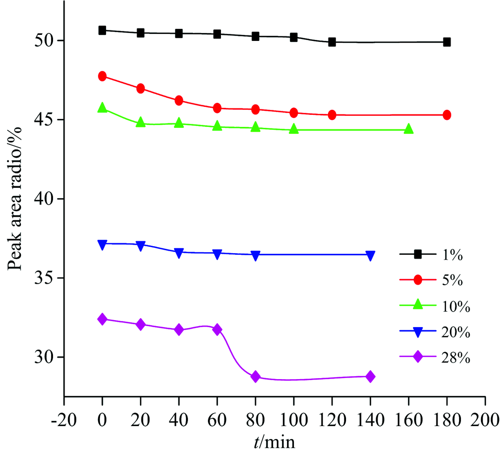 图5是磁化2 h后质量分数不同的NH4Cl水溶液DDAA+DA峰面积比变化图, 由图5可知, 各个质量分数的NH4Cl水溶液DDAA+DA型氢键峰面积比都随着磁化时间的增加而降低, 当达到饱和磁化时间后, 峰面积比值趋于平缓, 不再发生变化。 这说明当达到饱和磁化时间后, 氢键不再发生变化。 林珂等[14]将DA型氢键归属为DDAA型氢键, 由此可以认为DDAA型氢键结构整体上是随磁化时间增加而减少的, 证明磁化时间的增加对四面体水结构具有破坏作用。