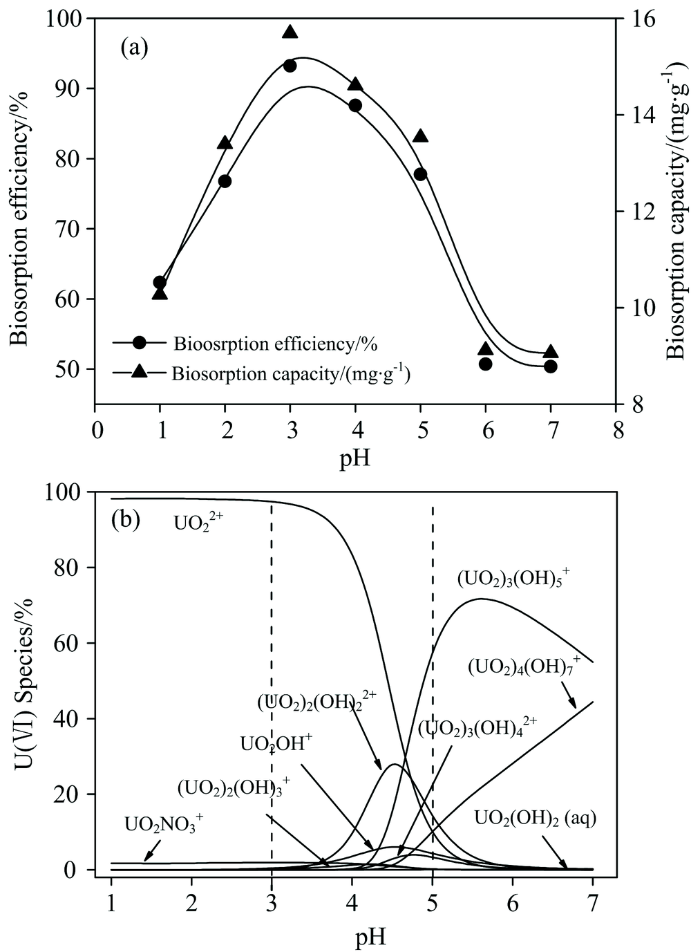 在实验过程中, 吸附体系pH值会影响细胞表面官能团的质子化程度和溶液中铀的存在形态, 进而影响到铀的生物利用度[8]。 我们利用Visual Minteq 3.1软件模拟了不同pH值下U(Ⅵ )在溶液中的分布形态, 如图1(b)所示。 当pH≤ 3.0时, U(Ⅵ )主要以带正电的