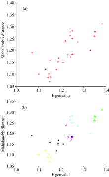 在实验过程中存在着人为因素例如仪器操作不当、 土壤样品搅拌程度不够等因素, 导致小部分实验数据不准确, 使用这些偏差较大的数据进行分析时会使得分析结果精度低, 所以应予以剔除。 原始矩阵图是在二维空间的坐标系中以样本点的形式体现数据的差异, 计算了马氏距离和使用了NJW聚类分析的方式, 使原始矩阵图切割成几个子图, 使得几个子图间相似度最弱而每个子图里样本数据相似度强。 图1是相同含水量下的原始数据矩阵经过NJW聚类分析结果图。