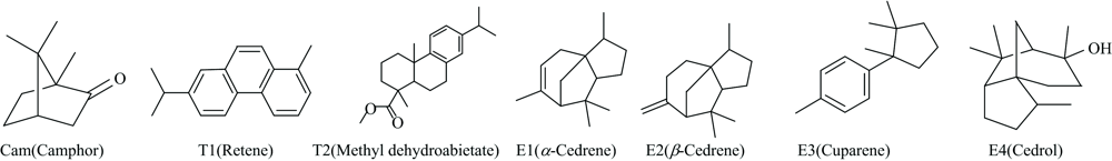 江陵九店战国墨中同时检测出樟脑(Cam)化合物, 应为墨中的添加剂, 其化学结构见图8。 古代制墨过程中常添加一些特殊功效的中药材如冰片、 丁香和樟脑等, 用以改善墨的气味、 色泽和耐久性等。 另外, 在江陵九店战国墨中发现了雪松油相关的芳香化合物, 分别为α -柏木烯(E1, 3.12%)、 β -雪松烯(E2, 1.97%)、 花侧柏烯(E3, 1.72%)和雪松醇(E4, 4.76%), 说明江陵九店战国墨中有用芳香剂雪松油添加剂。 在江陵九店战国墨中未检测出胶结物相关的特征化合物, 红外光谱也未检测出与胶结物相关的官能团红外吸收峰。