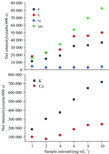 (3)通过添加不同质量的粉末样品于5 mL去离子水中对样品量进行分析。 结果显示样品量过低会导致制样重复性较差, 而过高的进样量会导致元素达到饱和状态, 样品薄膜厚度超过射线的测量厚度, 有可能不再处于全反射条件下。 对于植物粉末样品20 mg/5 mL是一个较为合适的样品量。